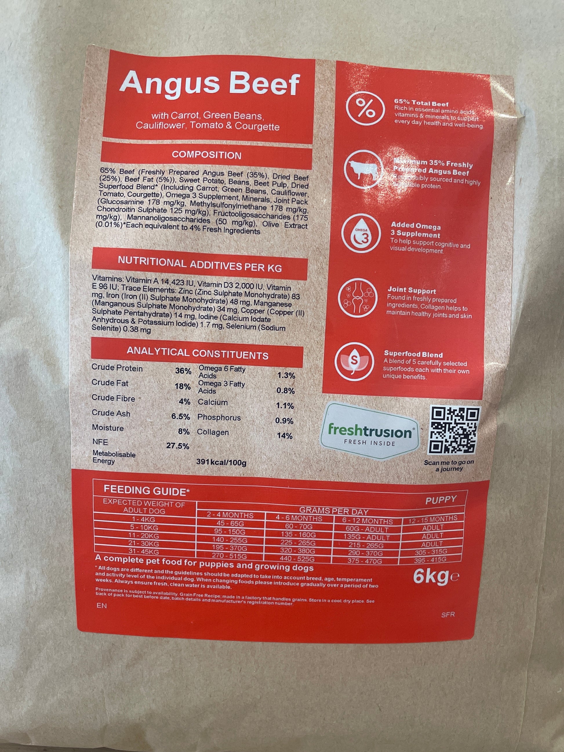 Our new puppy blend is 65% total Angus beef, and with a minimum 35% freshly prepared Angus beef.
